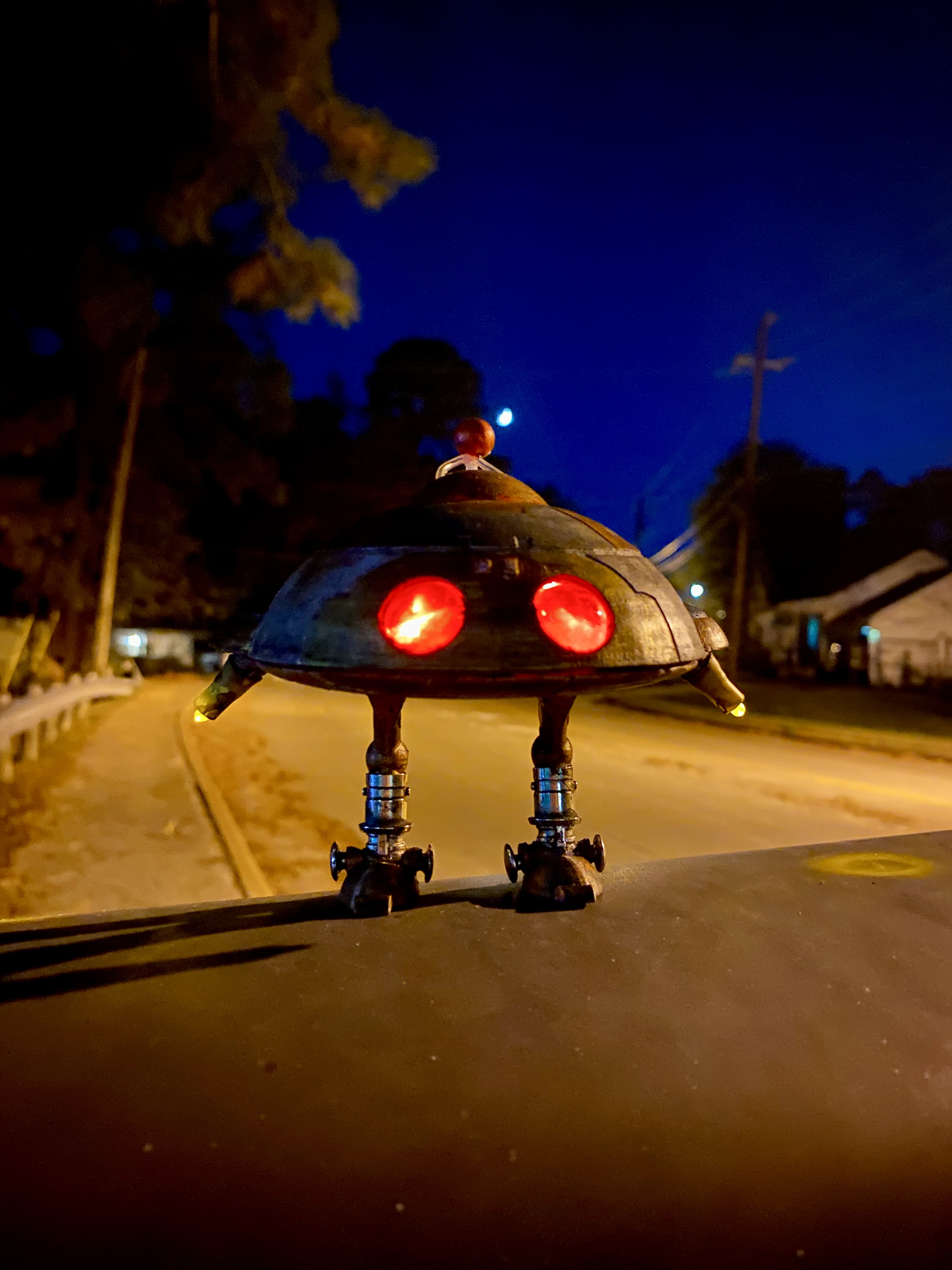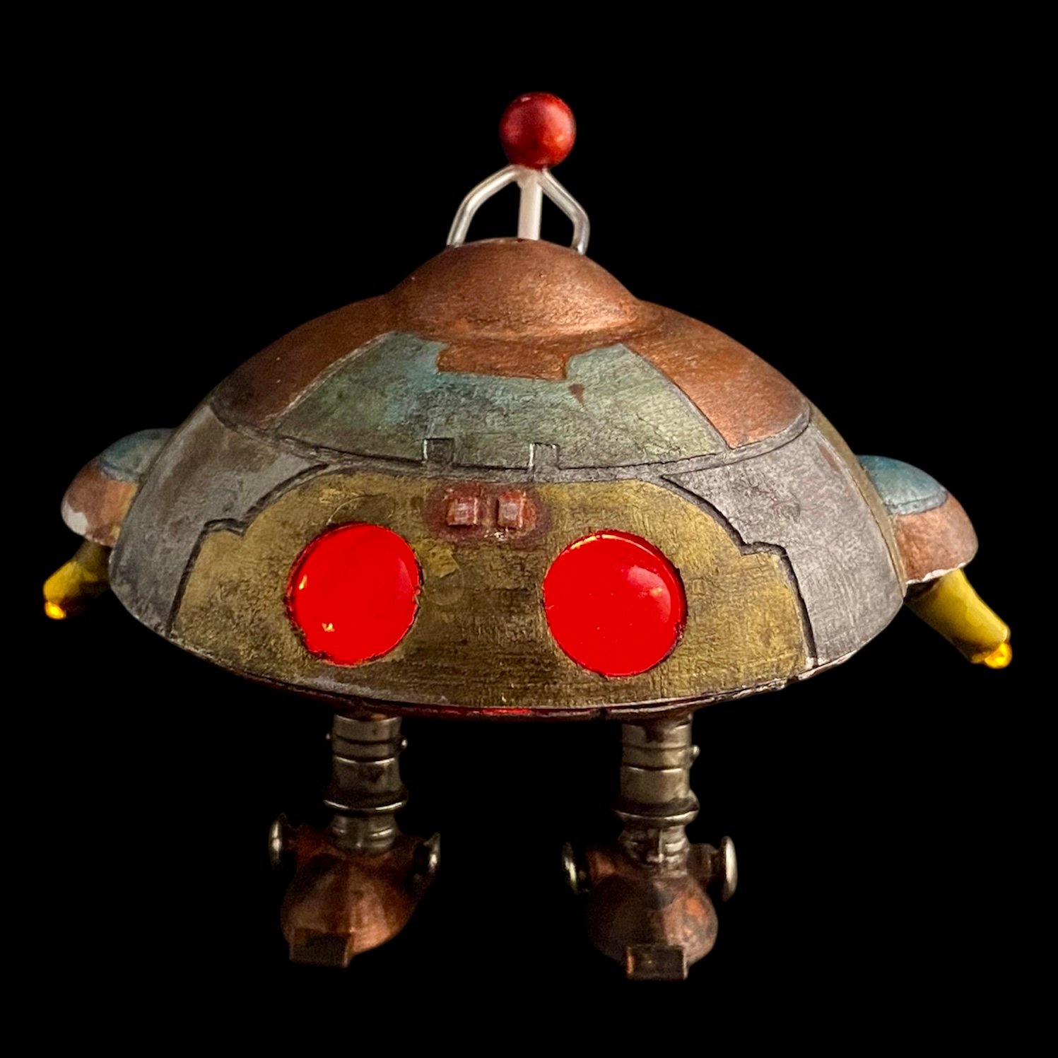 Light up Little Guy from Batteries Not Included. This piece is a mish mash of different materials. Top comes off to access battery. Switch is the middle “tail” on the back. Can be finicky, it is an art piece. Ships free in the USA.